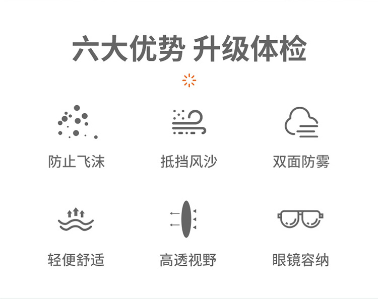 海納斯醫用防塵防護眼鏡六大優勢升級體檢,防止飛沫、抵擋風沙、雙面防霧、輕便舒適、高透視野、眼鏡容納。