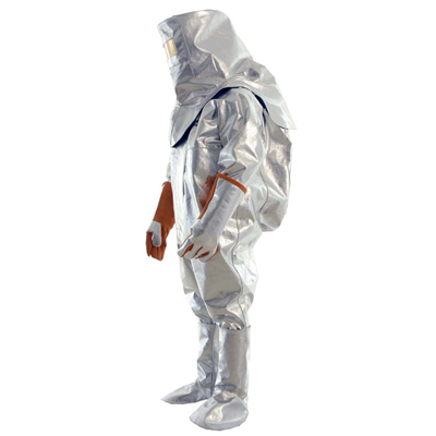 這款隔熱服是帶呼吸器背囊連體服,鍍鋁涂層阻燃復合面料(不含石棉),頭罩帶又可更換鍍金面屏,手套掌面為牛皮材質,靴套采用魔術貼粘貼于小腿部。代爾塔402202隔熱服可以有效保護高溫場所作業人員抵御高溫灼傷。套裝包含:頭罩、連體服、手套、靴套。