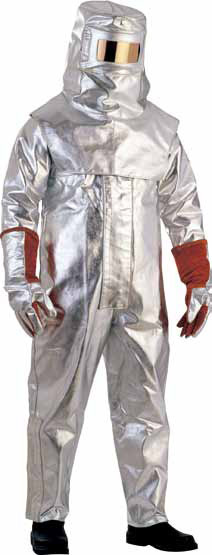 隔熱服符合歐標EN366、EN367、EN373標準,服裝表面采用鍍鋁隔熱面料(不含石棉),頭罩可單獨配