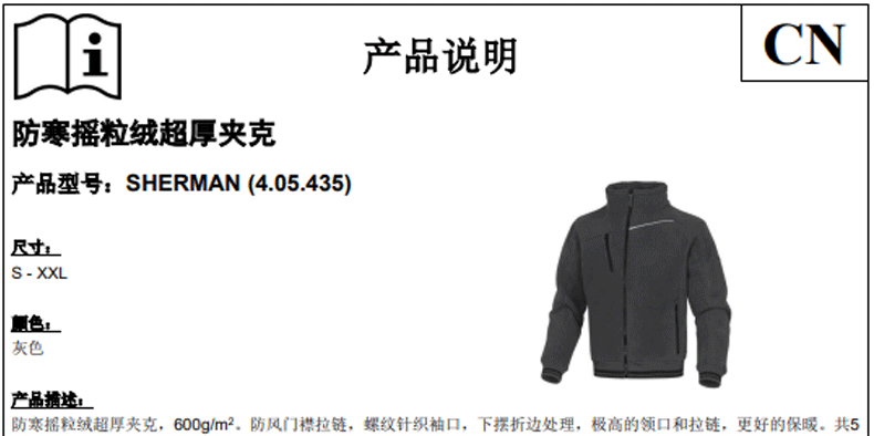 代爾塔405435搖粒絨超厚夾克防寒服600g/m2。防風門襟拉鏈,螺紋針織袖口,下擺折邊處理,極高的領口和拉鏈,更好的保暖。共5個口袋,其中3個外部口袋,2個內袋。